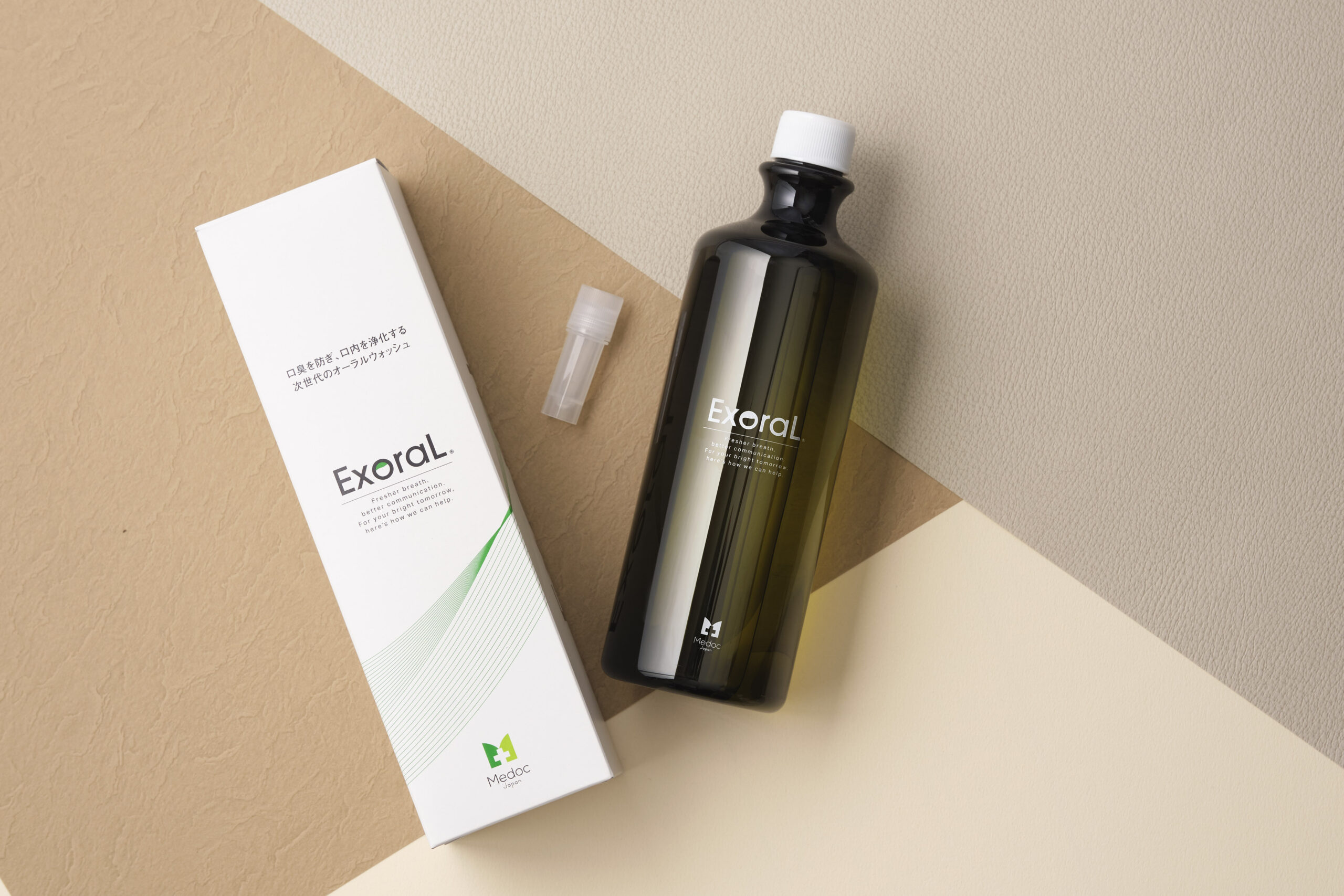 「日本人の口臭をなくしていきたい!」という理念のもと、研究に12年もの歳月を費やして開発したのが、新製品のマウスウォッシュ「ExoraL®(エクスオーラ®)」。歯科医院やクリニック等に通って治療したり、処方されるのではなく、通院不要で通販で誰もが入手できる口臭予防と口内浄化に特化した一般向けの商品です。「ExoraL®(エクスオーラ®)」は、毎日使うものだからこそ、お口にやさしい唾液と同じ中性にこだわり、アルコールなどの刺激の強い成分やハッカのような強い香料を含まず、ほのかなミント香の微香料で、金属腐食が起こりにくく、詰め物や入れ歯が入っている人でも使用可能となります。「1回20秒すすぐだけ」と、誰もが簡単に毎日の習慣として使い続けることができるマウスウォッシュとなります。